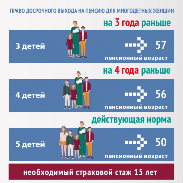 В рамках нового законодательства многодетные матери с тремя и четырьмя детьми (воспитавшие их до 8 летнего возраста) впервые получили право досрочного выхода на пенсию. Если у женщины трое детей, она может выйти на пенсию на три года раньше нового пенсионного возраста, но не ранее достижения возраста – 57 лет. Если у женщины четверо детей – на четыре года раньше нового пенсионного возраста, но не ранее достижения возраста – 56 лет. Матери пяти и более детей (воспитавшие их до 8 летнего возраста) по-прежнему смогут выходить на пенсию в 50 лет.